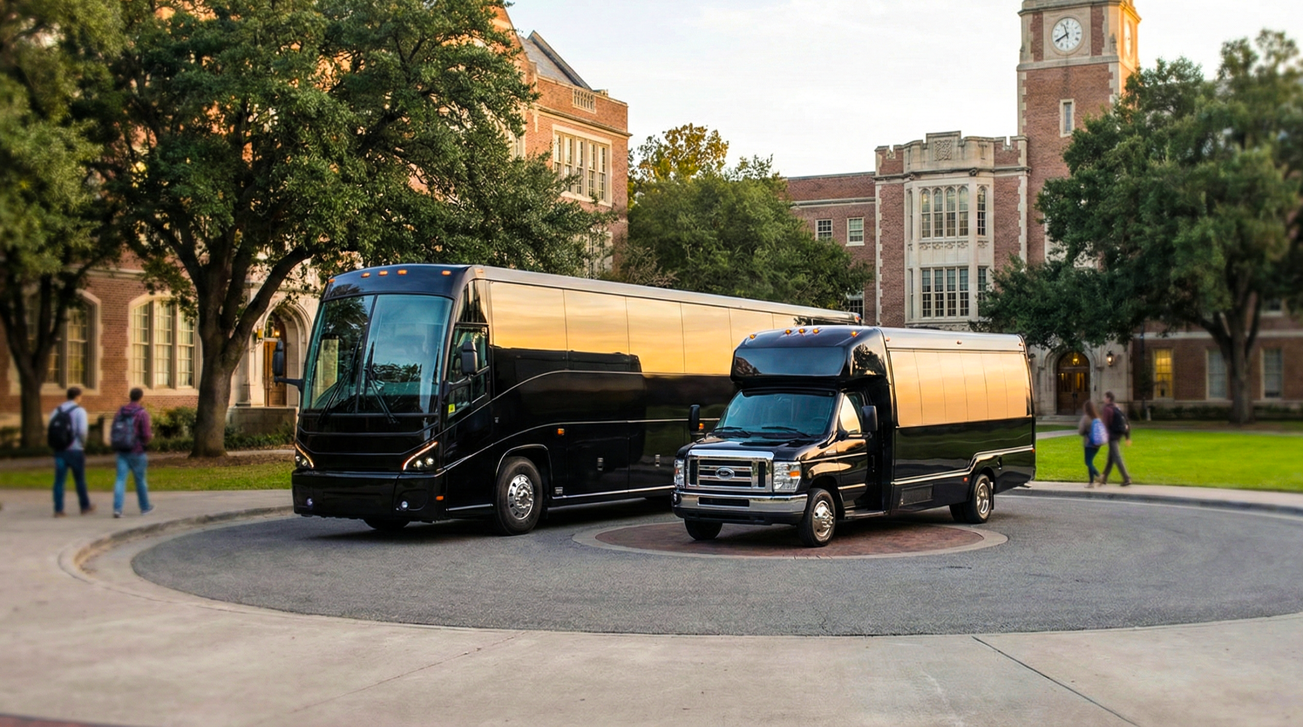 Charter buses and minibuses built for conferences, sports teams, corporate events, and coordinated multi-vehicle movements across Texas.